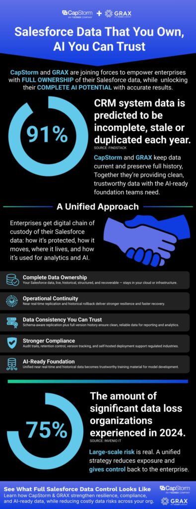 - Enterprise AI Adoption Accelerates — Organizations moving beyond AI pilot programs to a production AI data strategy need unrestricted access to their complete historical datasets. GRAX and CapStorm enable this by moving data off-platform to environments enterprises fully control (in the cloud or on-prem).