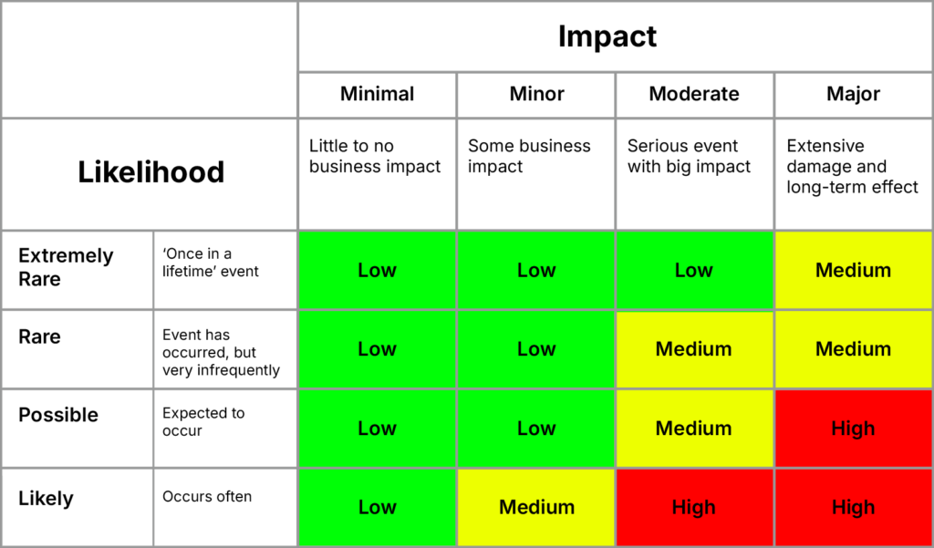 To best prepare for Salesforce disaster recovery scenarios or Issues that may impact business continuity, it’s first recommended to define the likelihood of the event compared to its potential impact (or severity) on the business. Then prioritize your planning and efforts to ensure events that have the higher priority are covered in more detail than the lower priority items.  Below is an example of a risk matrix to help determine High to Low priority Disaster Recovery and Business Continuity scenarios.
